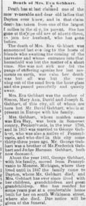 Mrs. Gebbart, whose maiden name was Eva Hay, was born in Somerset county, Pennsylvania, in the year 1790, and in 1815 was married to George Gebhart, who was also a native of Pennsilvania, and who died in this city some thirty-three years ago. Mr. George Gebhart was a brother of Mr. Frederick Gebbart and Judge Harman Gebhart, both now deceased. About the year 1883, George Gebbart, with his family, moved from Pennsylvania to Monroe, Michigan, where they lived until in 1847 the family came to Dayton, where Mr. Gebhart died, and Mrs. Gebhart has ever since lived with her children, grandchildren and great grandchildren.