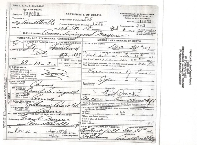 Anna Livingood Meyers Death Certificate